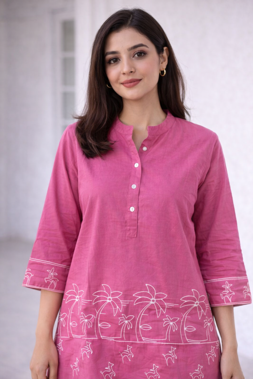 Step into effortless comfort with this elegant Blush Palm Printed Cotton Co-Ord Set. Crafted from soft, breathable cotton, this two-piece set features a straight-fit kurta with a clean band collar and delicate palm-inspired handprint detailing along the hem and sleeves. Paired with matching relaxed-fit pants, the set offers a perfect blend of simplicity and style. The soothing pink tone adds a fresh, graceful touch, making it ideal for everyday elegance.