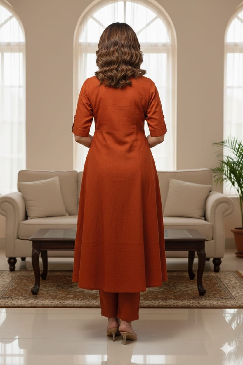Elegant Orange Cotton A-Line Kurta Set with Mandarin Collar