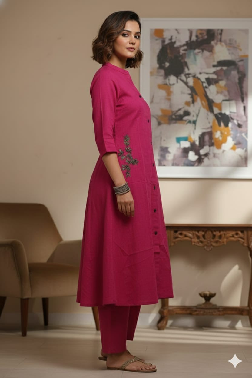 Elegant Rani Pink Cotton A-Line Kurta Set with Mandarin Collar