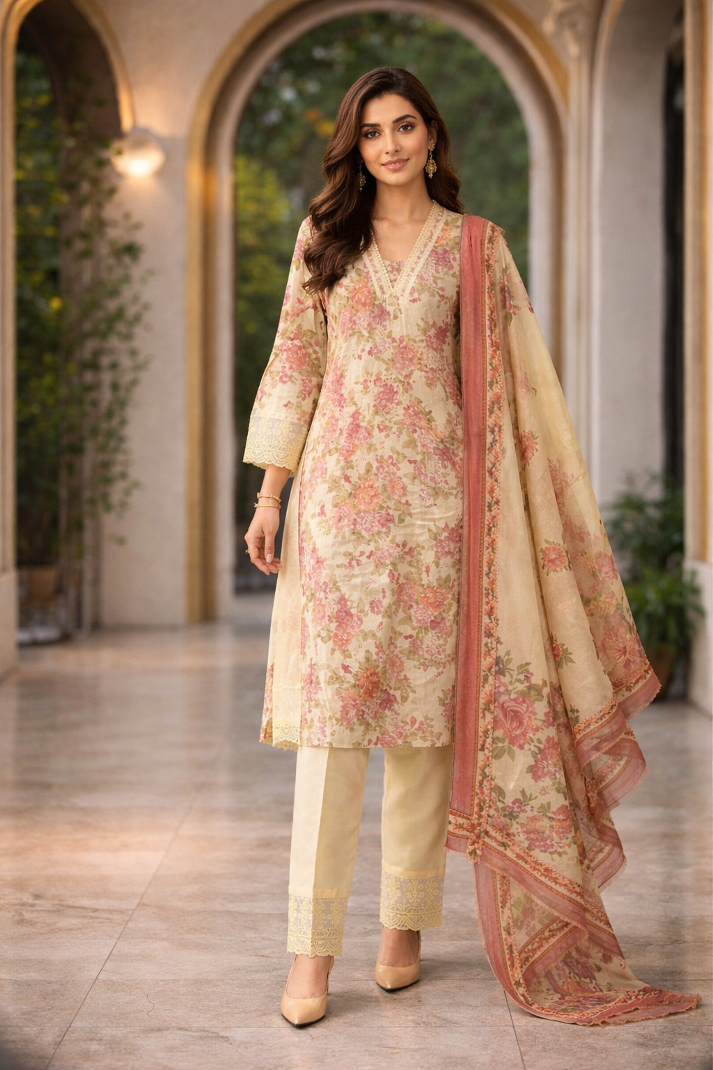 Paired with comfortable straight-fit pants in a matching pastel ivory tone, the set offers ease of movement while maintaining a polished silhouette. The look is completed with a lightweight floral dupatta featuring a soft contrast border, perfectly tying the ensemble together.