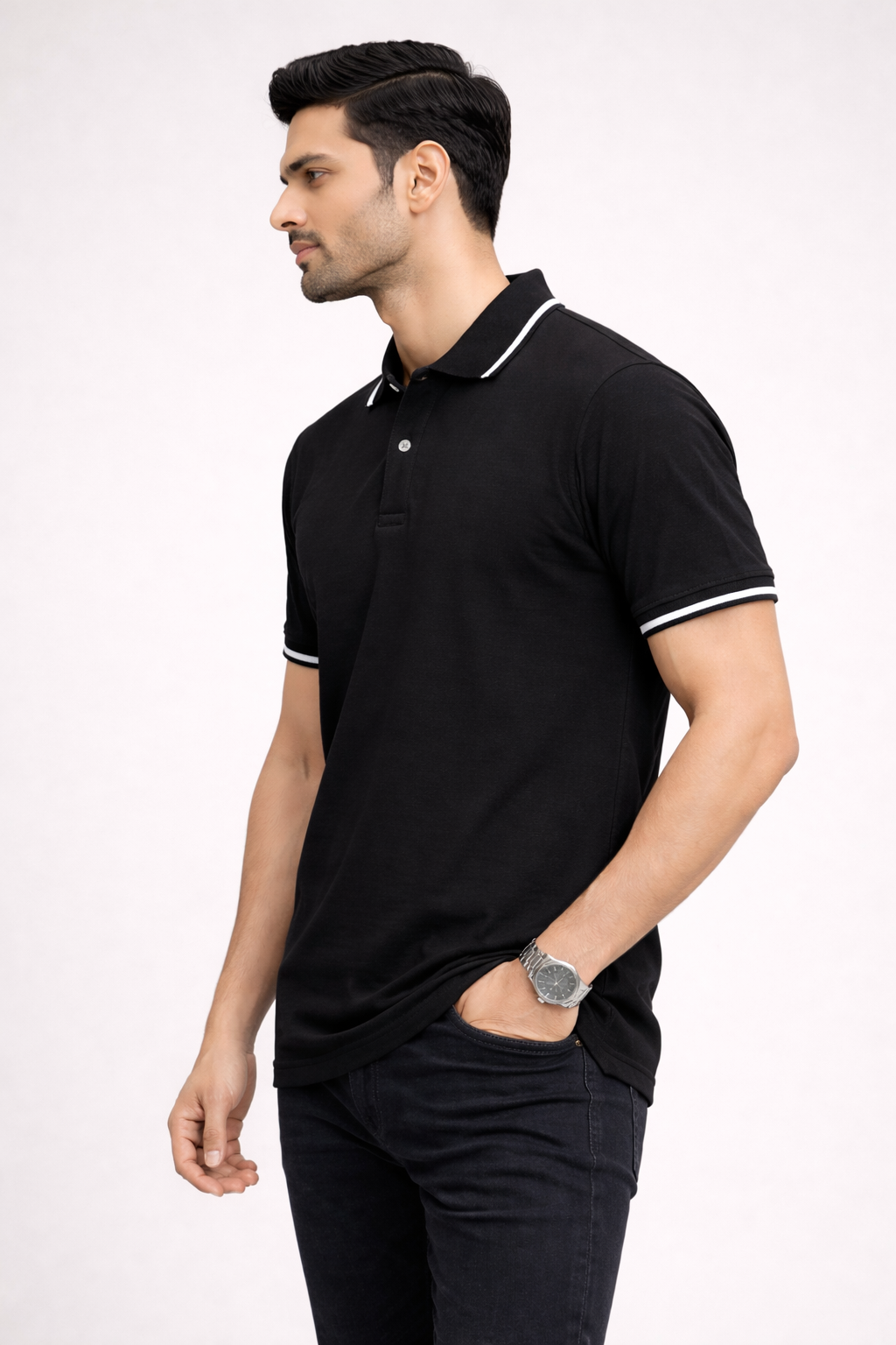 A wardrobe essential built for versatility — this black polo t-shirt features a refined design with contrast white tipping on the collar and sleeve hems, adding a sharp and classy touch.
