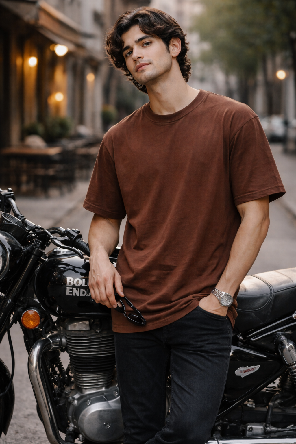 Men’s Brown “BELIEVE” Back Graphic Oversized Cotton T-Shirt