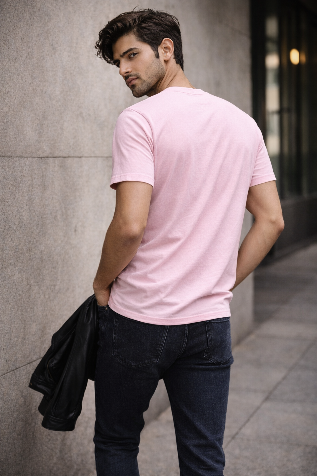 The pastel pink base paired with striking red and black typography creates a modern, upbeat look that works well for casual outings, leisure wear, or styling with denim for a street-style vibe.