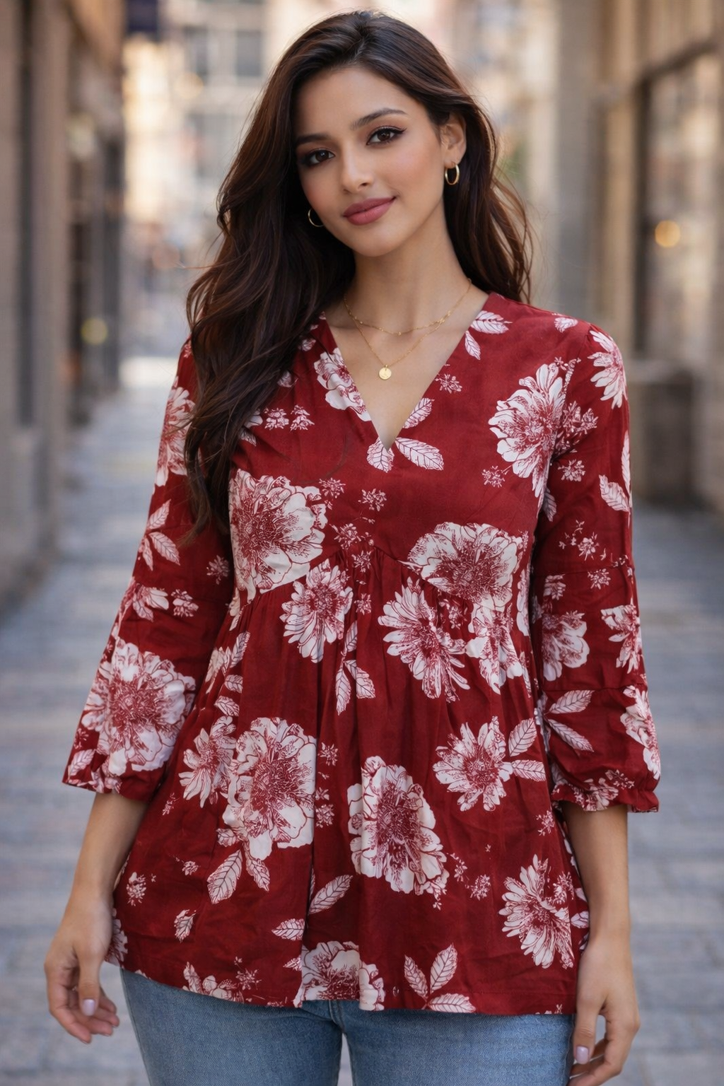 Elevate your everyday style with this elegant floral printed cotton tunic top in a rich wine red shade. Designed with a flattering V-neckline and soft gathers below the bust, this tunic creates a graceful, flowy silhouette while ensuring all-day comfort.