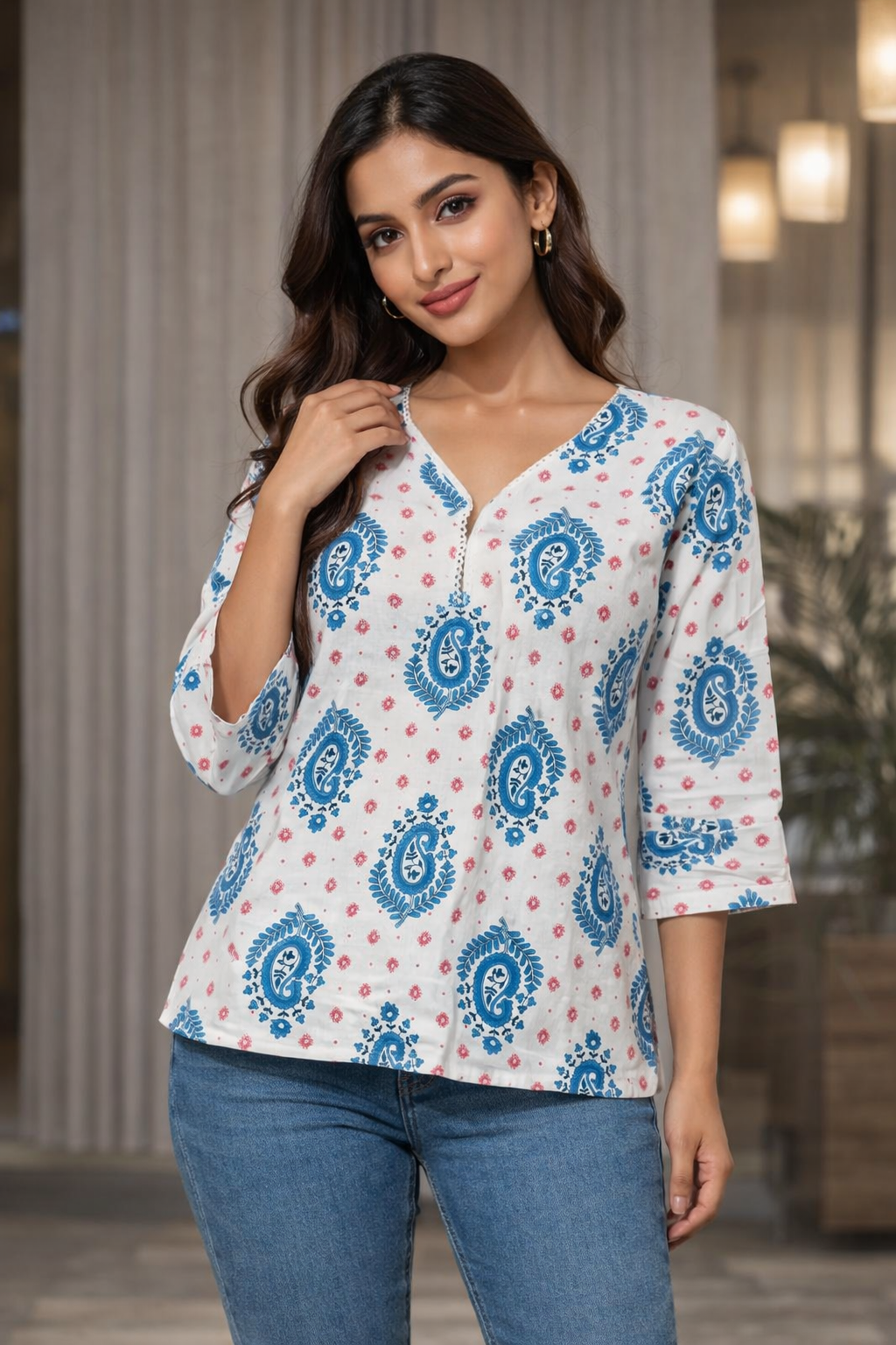 Brighten your everyday wardrobe with this elegant printed cotton tunic top featuring a soft white base highlighted by classic blue paisley motifs and delicate pink floral accents. Designed with a flattering V-neckline and a clean straight-fit silhouette, this tunic offers both comfort and timeless Indo-western charm.